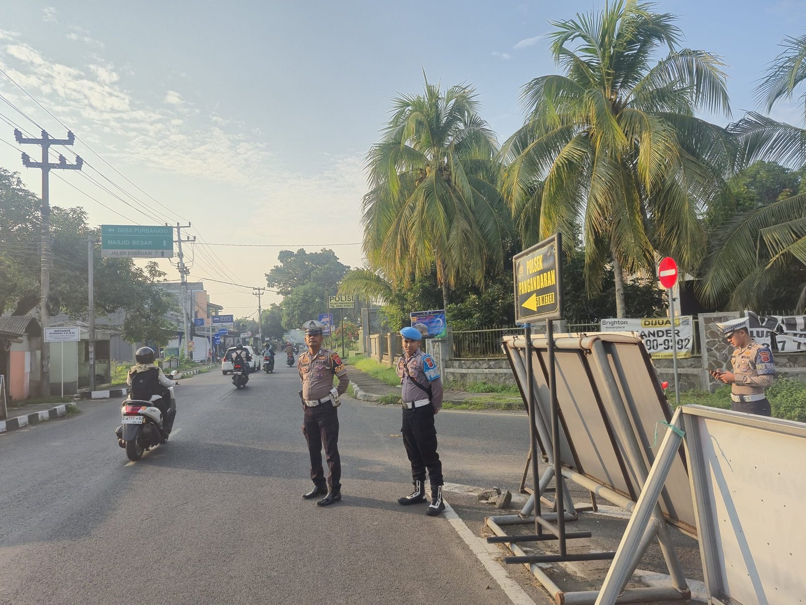 Pangandaran — Anggota Polres Pangandaran melaksanakan kegiatan pengaturan lalu lintas (gatur) di Simpang Tiga Bank BJB Pangandaran pada Selasa pagi (25/11/2025). Kegiatan ini dilakukan untuk memastikan kelancaran arus kendaraan yang meningkat pada jam sibuk serta memberikan rasa aman bagi masyarakat yang melintas di kawasan tersebut.