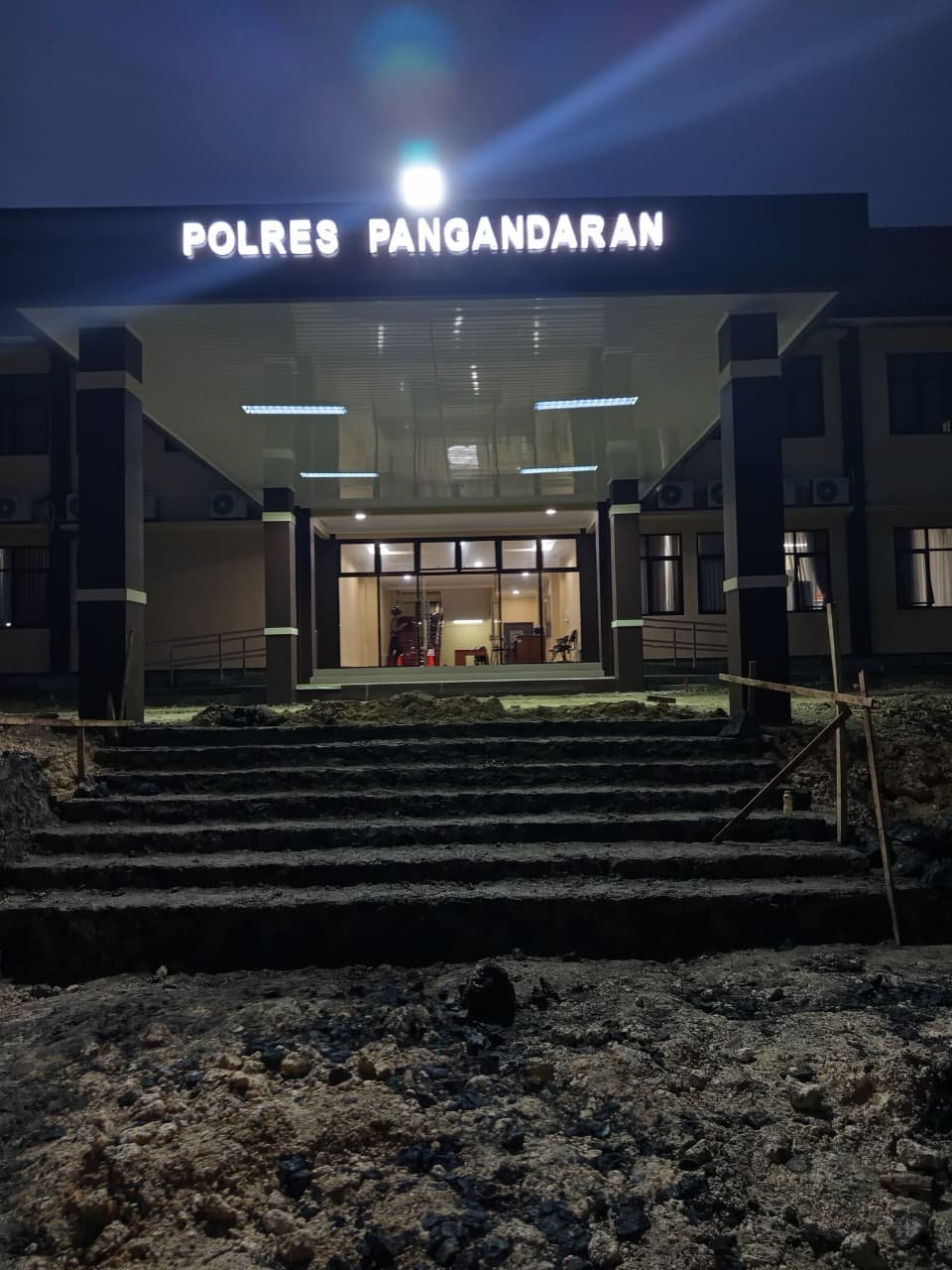 Salah satu bagian yang mencuri perhatian adalah pintu utama Mako Polres Pangandaran. Pintu tersebut kini mulai dihiasi dengan sentuhan bangunan baru yang modern, menambah kesan megah sekaligus menjadi simbol perubahan wajah baru markas kepolisian di Pangandaran.