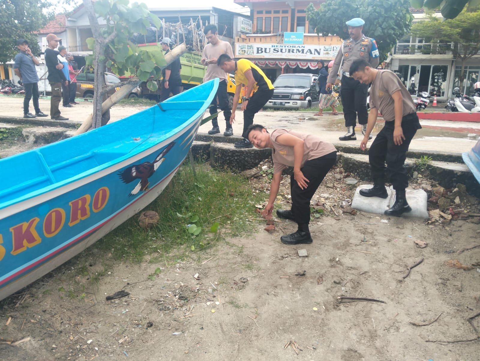 Kegiatan gotong royong tersebut berlangsung penuh semangat dan kekompakan. Personel kepolisian bahu-membahu bersama warga mengumpulkan sampah plastik, dedaunan kering, serta limbah lainnya agar area pantai tetap bersih dan nyaman dikunjungi wisatawan.