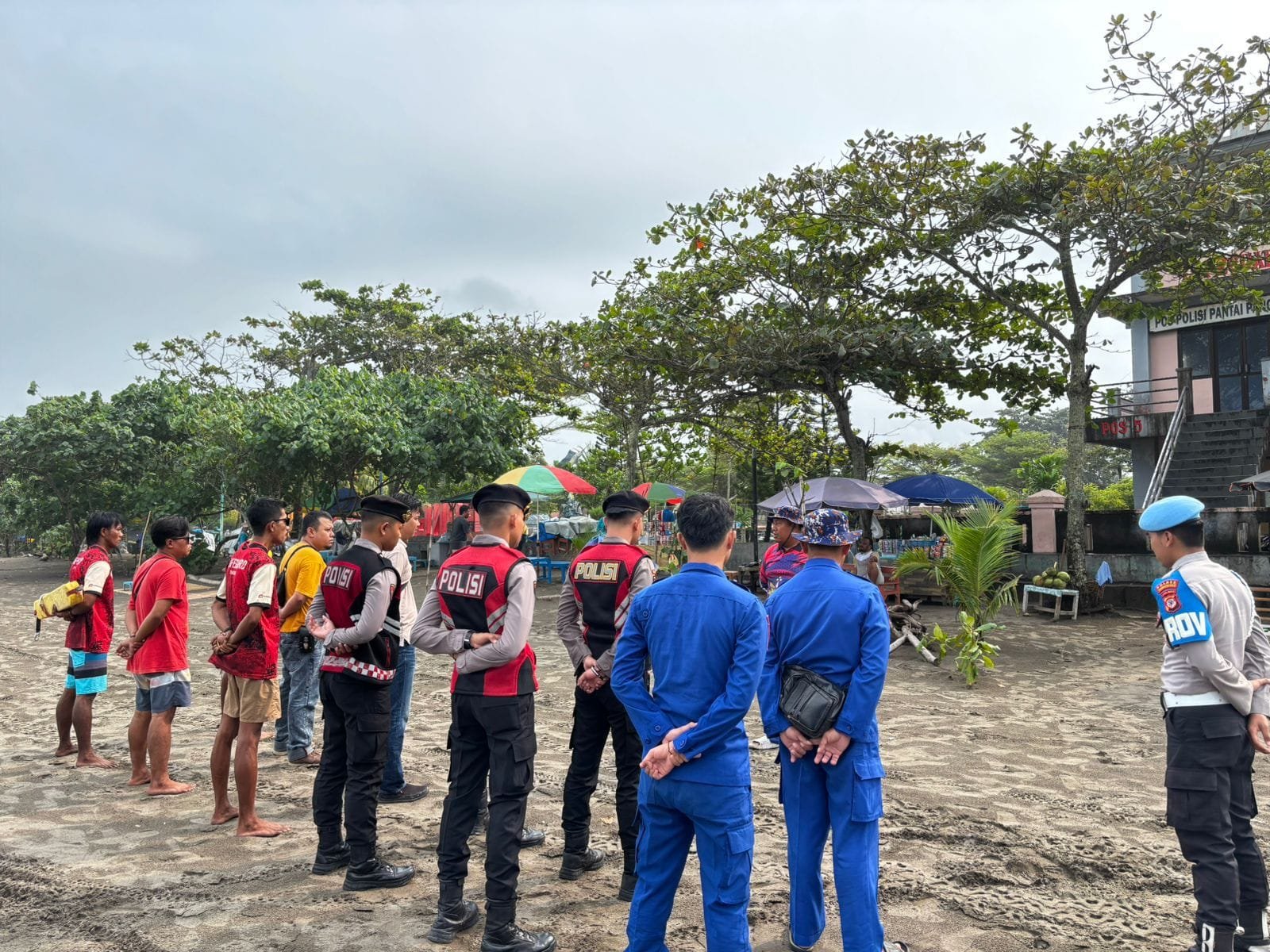 Polisi memberikan edukasi kepada pengunjung seputar keselamatan, termasuk peringatan tentang bahaya aktivitas air dan pentingnya mengikuti arahan petugas pantai.