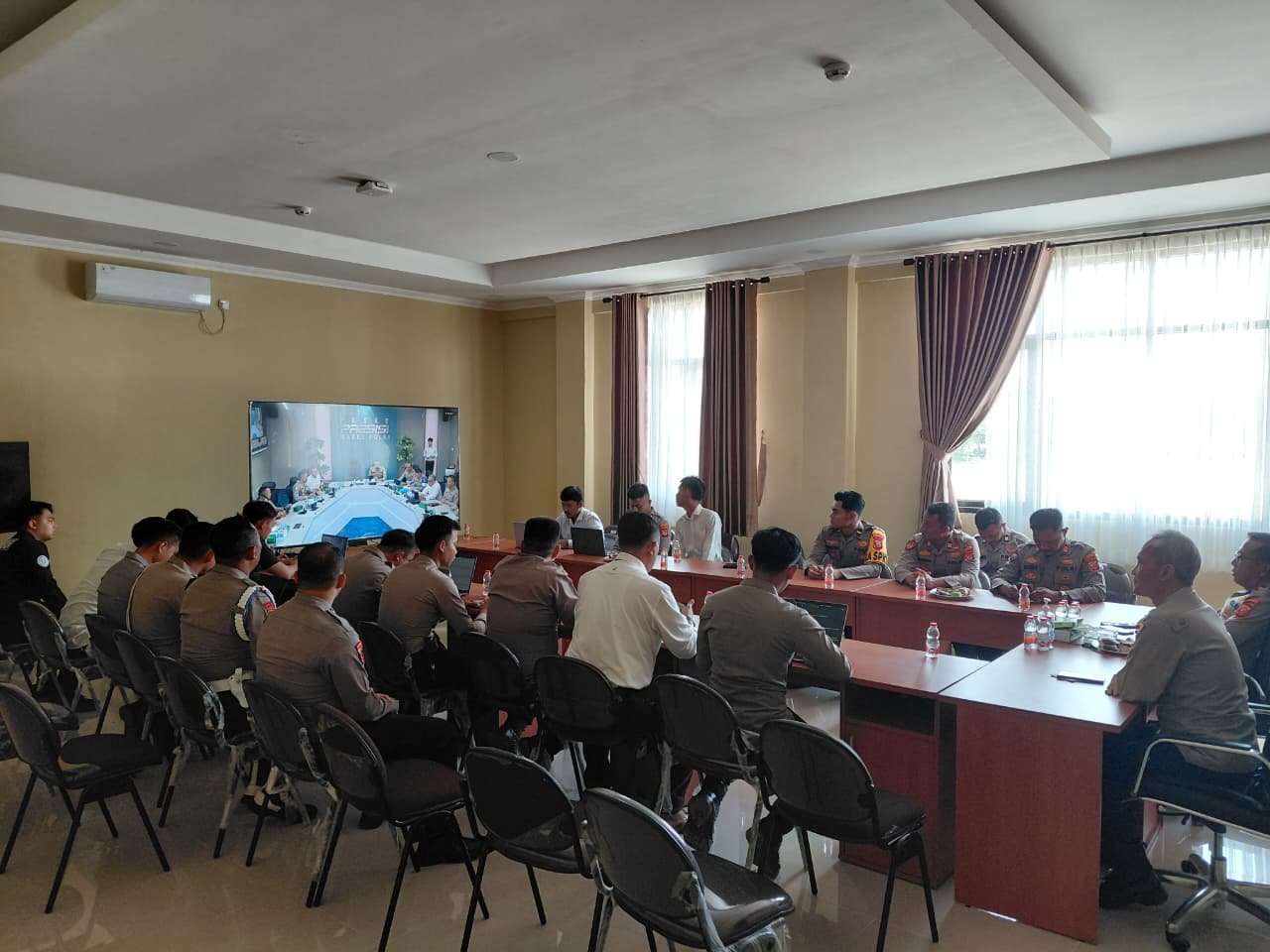 Kegiatan yang berlangsung dari pukul 09.00 hingga 11.00 WIB ini dipimpin langsung oleh Kaposko Presisi, Brigjen. Pol. Dr. Indarto, dari Mabes Polri. Seluruh jajaran di Polres Pangandaran, dipimpin oleh Waka Polres, menyimak arahan dan paparan yang disampaikan secara virtual, menunjukkan keseriusan dalam mengadopsi program dan evaluasi terbaru.