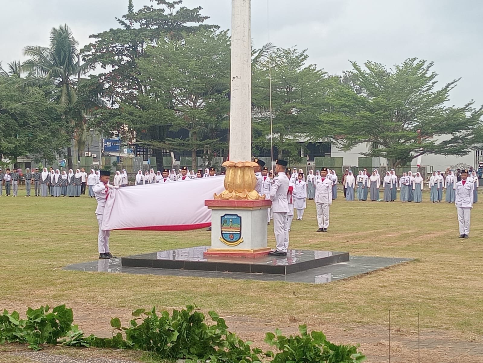 Peserta upacara terdiri dari ASN, pelajar SLTA, SLTP, dan SD yang membentuk barisan dengan penuh disiplin. Momen penurunan bendera berlangsung khidmat, diiringi rasa haru sekaligus kebanggaan akan perjuangan para pahlawan yang telah merebut kemerdekaan 80 tahun silam.