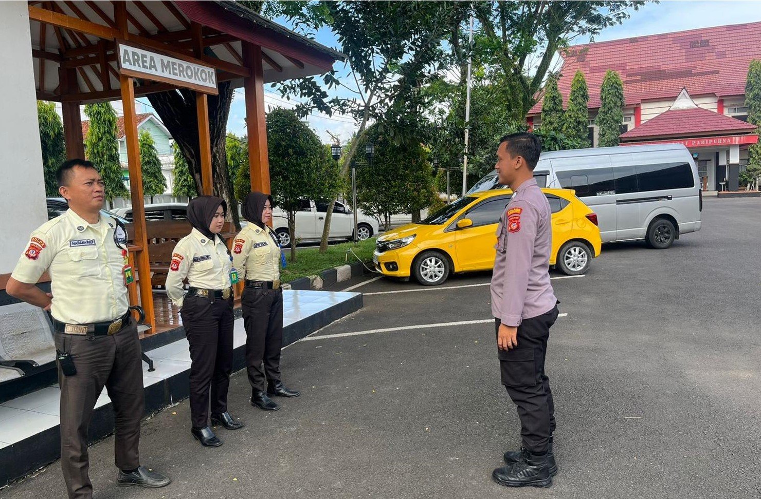 Menyampaikan Perpol No 4/2020 tentang Pamswakarsa dan Perpol No 1/2023 tentang Seragam Satpam, serta memeriksa pemakaian atribut. Satpam diingatkan untuk menjaga keamanan fisik, personal, informasi, dan teknis di lingkungan kerja. Mereka juga diminta mencatat semua aktivitas dalam buku mutasi.