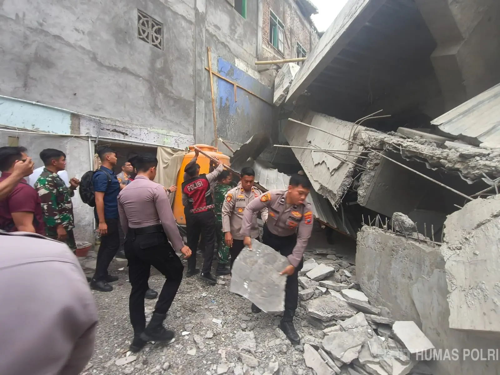 Sampai saat ini petugas gabungan tengah berupaya mengevakuasi para korban yang masih tertimbun material bangunan.
