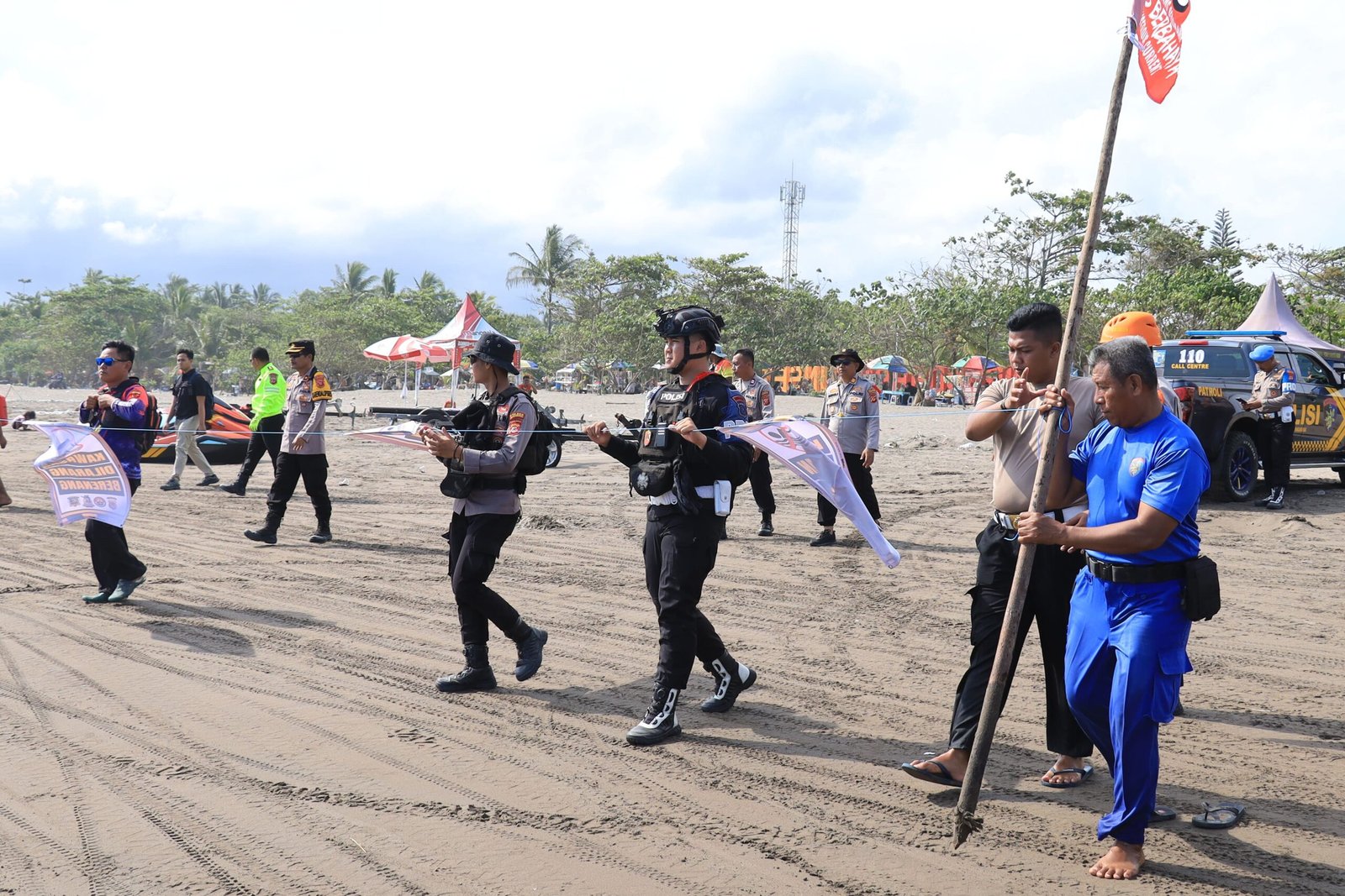Polres Pangandaran Bersama Brimob dan Polairud Pasang Rambu Batas Aman di Pantai