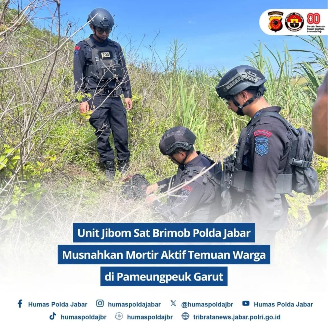 Unit Jibom Detasemen Jihandak Sat Brimob Polda Jabar melaksanakan pemusnahan sebuah mortir di Blok Cibujal, Desa Paas, Kecamatan Pameungpeuk. Kegiatan ini dilakukan di Kabupaten Garut, pada Minggu (7/9/2025). Mortir tersebut berukuran sekitar 80 cm. Diameter mortir itu 15 cm. Sebelumnya, warga Kampung Leuwinanggung menemukannya saat melakukan penggalian tanah untuk pembangunan pondasi rumah. Penemuan ini sempat membuat geger masyarakat karena kondisi mortir masih aktif.