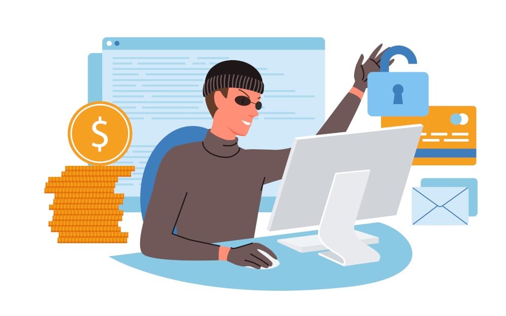 Thief hacking, cyber theft and online fraud vector illustration. Cartoon hacker using computer, criminal stealing personal digital data information and money. Cybercrime, internet safety concept