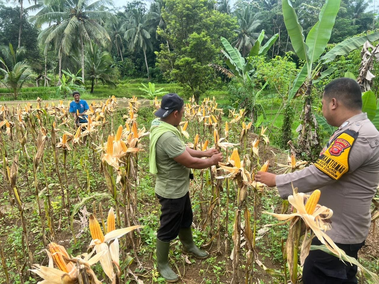 Pangandaran, 12 November 2025 — Polsek Cigugur Polres Pangandaran menunjukkan perannya dalam mendukung ketahanan pangan lokal dengan terlibat langsung dalam kegiatan panen jagung hibrida di Blok Cirawa, Dusun Cirawa RT 04 RW 06, Desa Cimindi, Kecamatan Cigugur, Rabu (12/11) pukul 08.00–10.30 WIB. Lahan milik kelompok tani Melati Mekar ini berhasil ditanami jagung yang siap dipanen.