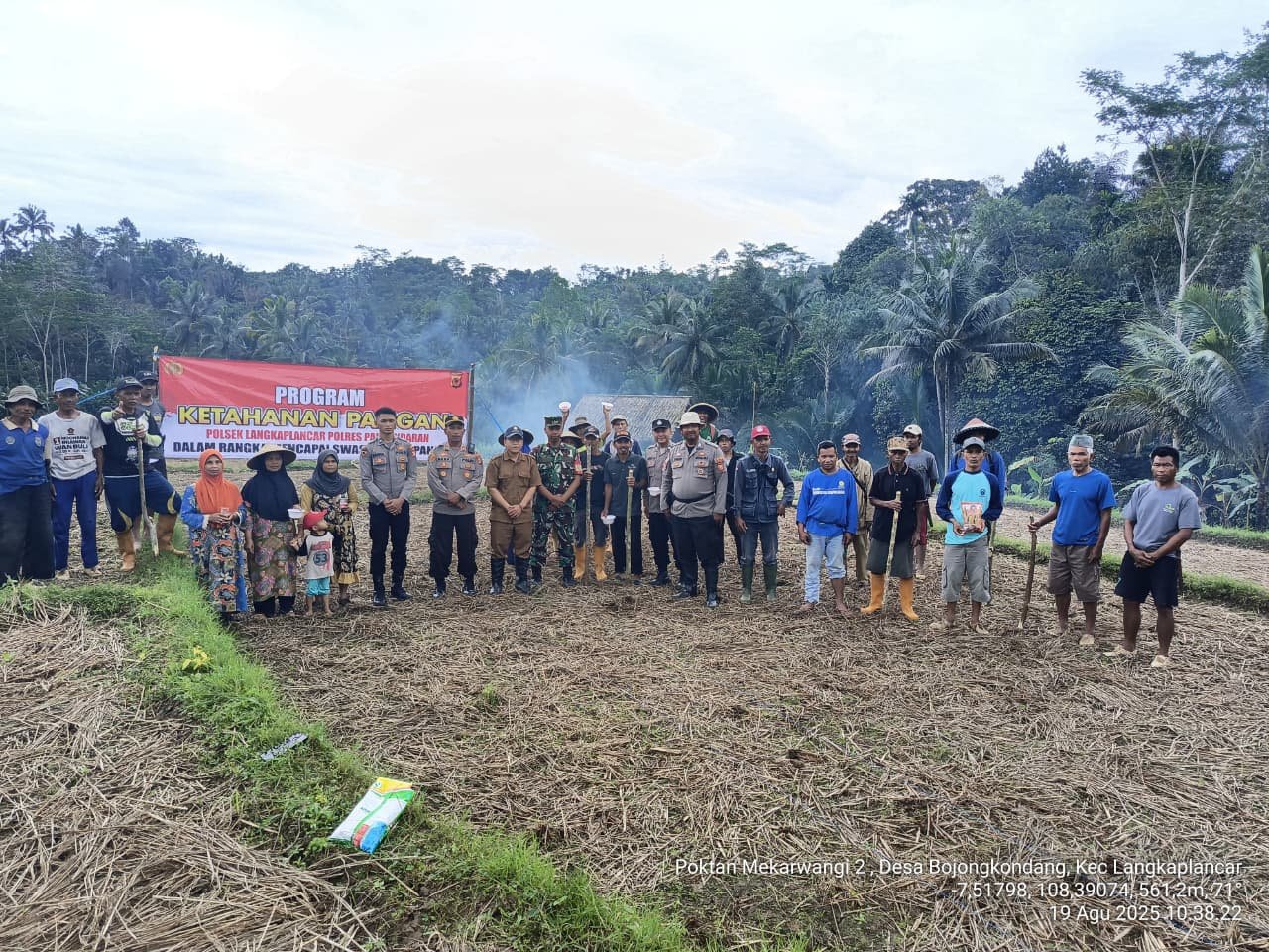 Polsek Langkaplancar bersama Forum Koordinasi Pimpinan Kecamatan dan kelompok tani Jaya Laksana, melaksanakan penanaman bibit jagung hibrida di lahan seluas 1,5 hektar. Pemerintah menggagas program ketahanan pangan ini, dan Polri melaksanakannya sebagai bagian dari kegiatan tersebut.