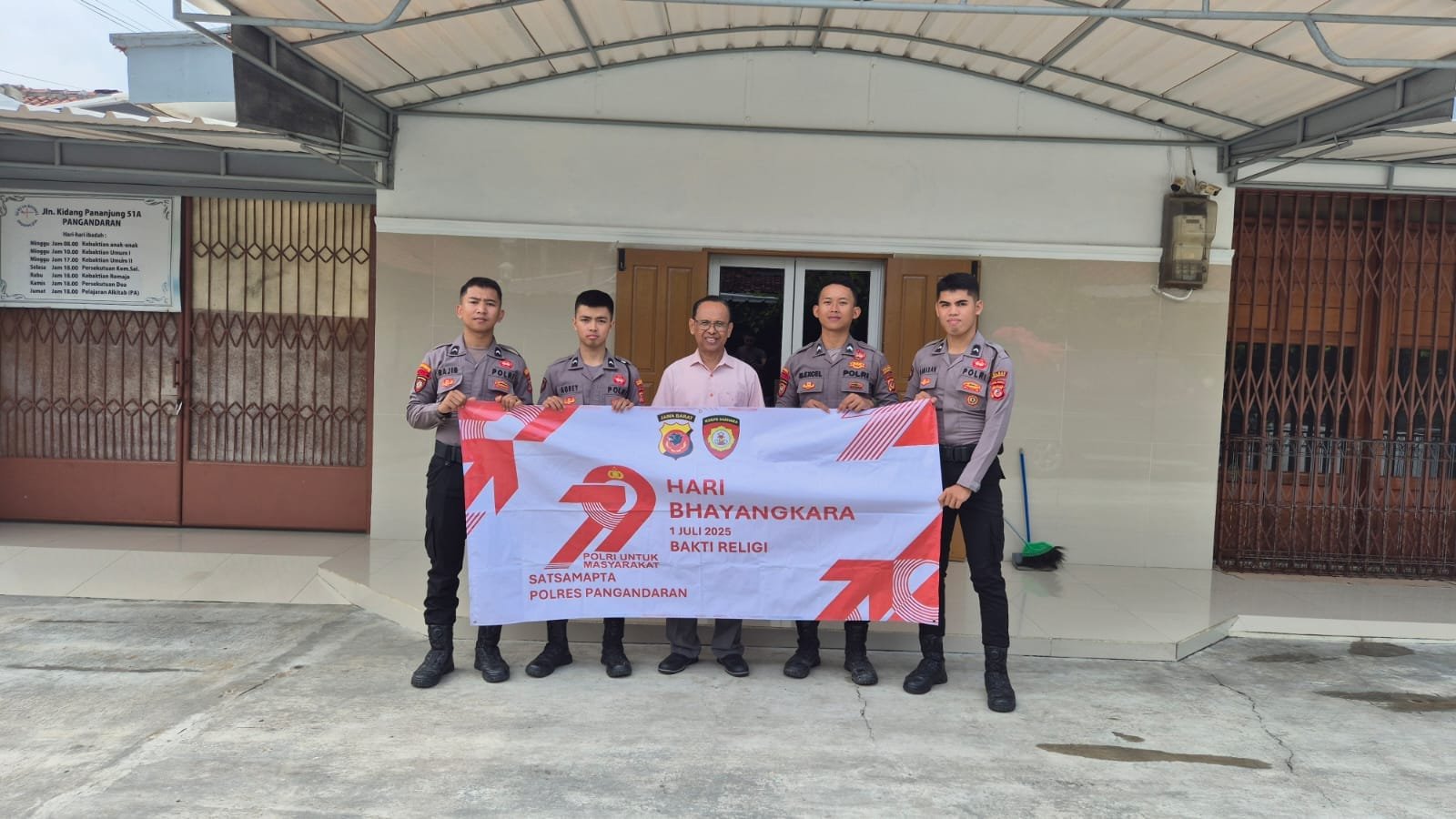 Pangandaran, 22 Juni 2025 – Dalam rangka menyambut Hari Ulang Tahun Bhayangkara ke-79, personel Polres Pangandaran melaksanakan kegiatan bakti sosial pada Minggu, 22 Juni 2025. Kali ini, fokus kegiatan adalah pembersihan Gereja Bethel Indonesia yang berlokasi di wilayah hukum Polres Pangandaran. Inisiatif ini menunjukkan komitmen Polri untuk hadir di tengah masyarakat dalam berbagai bentuk pelayanan.
