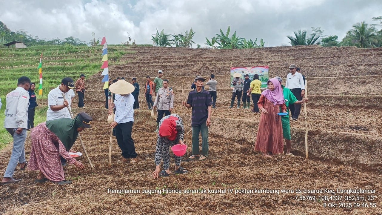 Pangandaran – Polsek Langkaplancar menunjukkan komitmen dalam mendukung Program Ketahanan Pangan nasional. Pada Rabu, 08 Oktober 2025, Polsek Langkaplancar bersama FORKOPINCAM, penyuluh pertanian, dan kelompok tani setempat melakukan penanaman perdana jagung hibrida di lahan 5 hektare, berlokasi di Blok Sawah Lega, Dusun Cisarua, Desa Cisarua.