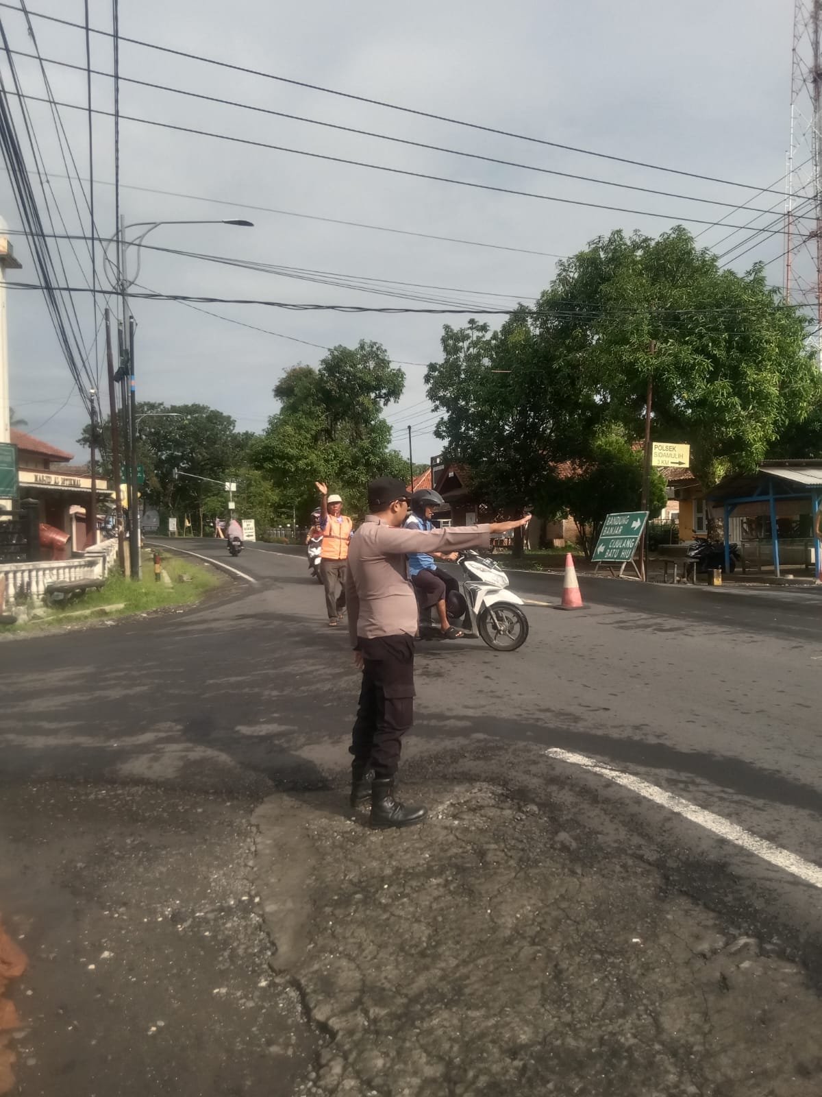Memberikan pelayanan prima kepada masyarakat, Bhabinkamtibmas Desa Cikembulan, Bripka Dindin Nuryadin, melaksanakan kegiatan pengaturan lalu lintas (gatur) siang di Simpang Empat (SP4) Desa Cikembulan, Kecamatan Sidamulih, Selasa (27/5).