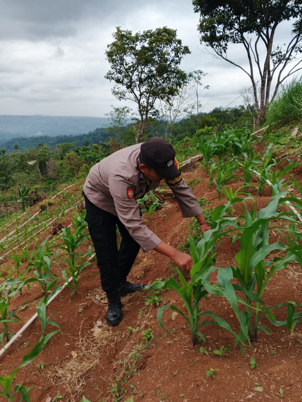 Briptu Muhammad Ramadhan melakukan pengecekan secara langsung untuk memantau pertumbuhan tanaman sekaligus mendata kondisi terkini. Diketahui saat ini tanaman jagung sedang memasuki masa penyemprotan karena munculnya serangan hama ulat. Informasi hasil monitoring tersebut telah dilaporkan secara resmi ke Badan Pusat Statistik (BPS) Kabupaten Pangandaran sebagai bagian dari pelaksanaan program Polri Presisi di sektor ketahanan pangan.