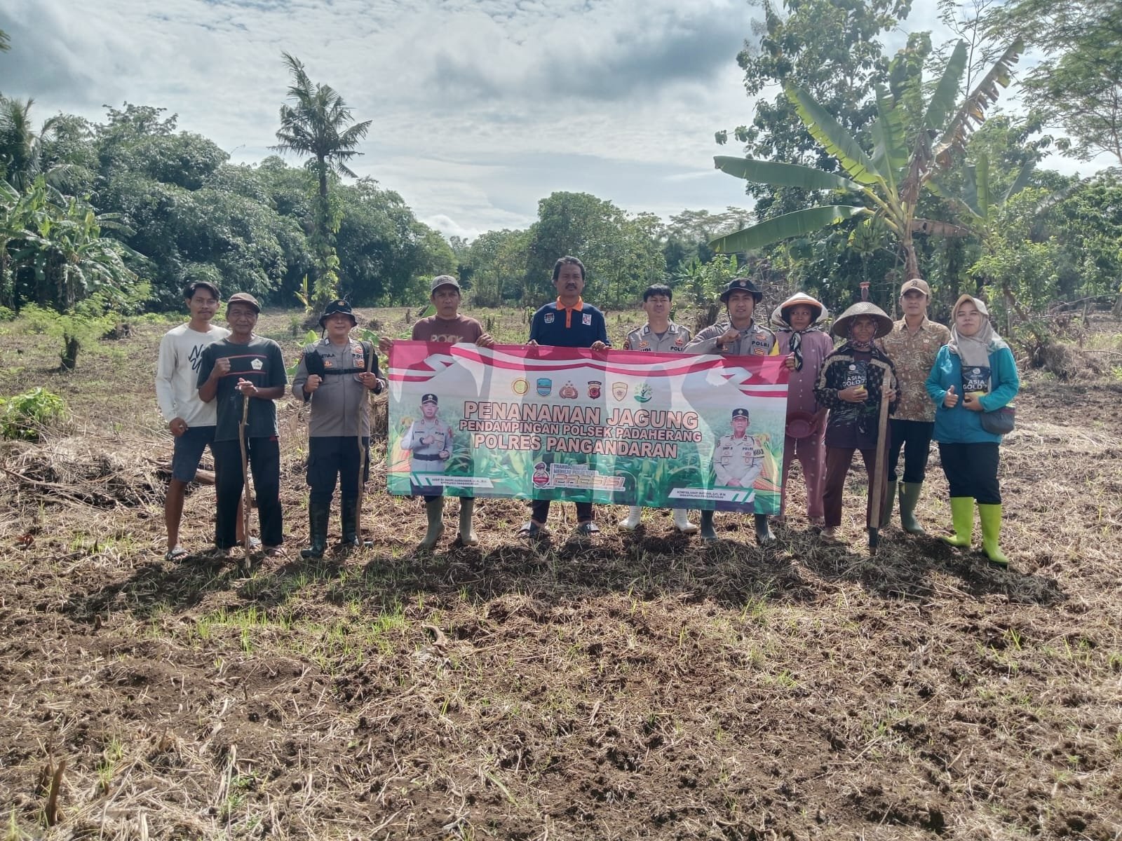 Kegiatan dimulai pukul 08.00 WIB dan dihadiri Kapolsek Padaherang, Danramil Padaherang, Kepala Desa Kertajaya, pengurus Bumdes Kertajaya, serta pemilik lahan Toni. Penanaman dilakukan di lahan seluas 5.600 meter persegi dengan menggunakan bibit jagung hibrida jenis Asia Gold 77 bantuan dari Kementerian Pertanian.