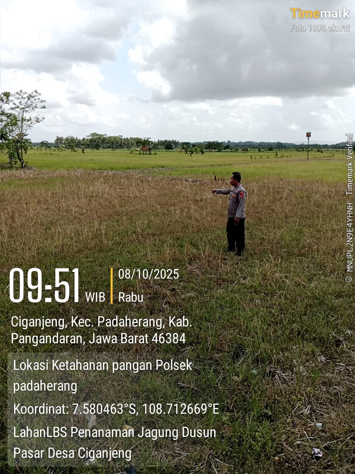 Pangandaran – Dalam rangka mendukung program ketahanan pangan nasional, Polsek Padaherang melaksanakan kegiatan pengecekan lahan yang akan digunakan untuk penanaman jagung di Dusun Pasar, Desa Ciganjeng, Kecamatan Padaherang, Kabupaten Pangandaran (08/10/2025).