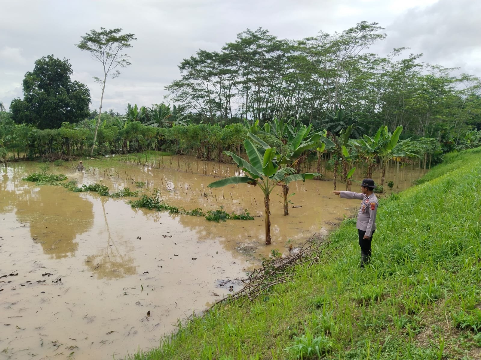Pangandaran — Jajaran Polsek Padaherang Polres Pangandaran melaksanakan kegiatan monitoring lahan jagung milik Kelompok Tani (Poktan) Ngudirahayu yang terdampak banjir akibat meluapnya aliran Sungai Citanduy di Dusun Maruyungsari, Desa Maruyungsari, Kecamatan Padaherang, Kabupaten Pangandaran, Rabu (12/11/2025).