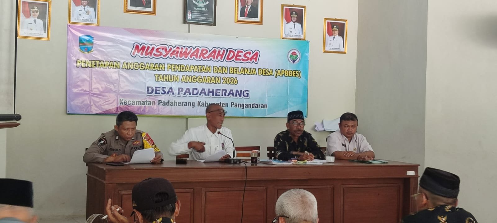 Pangandaran – Musyawarah Desa Penetapan Anggaran Pendapatan dan Belanja Desa (APDes) Tahun Anggaran 2026 dilaksanakan di Kantor Kepala Desa Padaherang, Kecamatan Padaherang, Kabupaten Pangandaran, pada Rabu (24/12/2025) pukul 09.00 WIB hingga selesai.