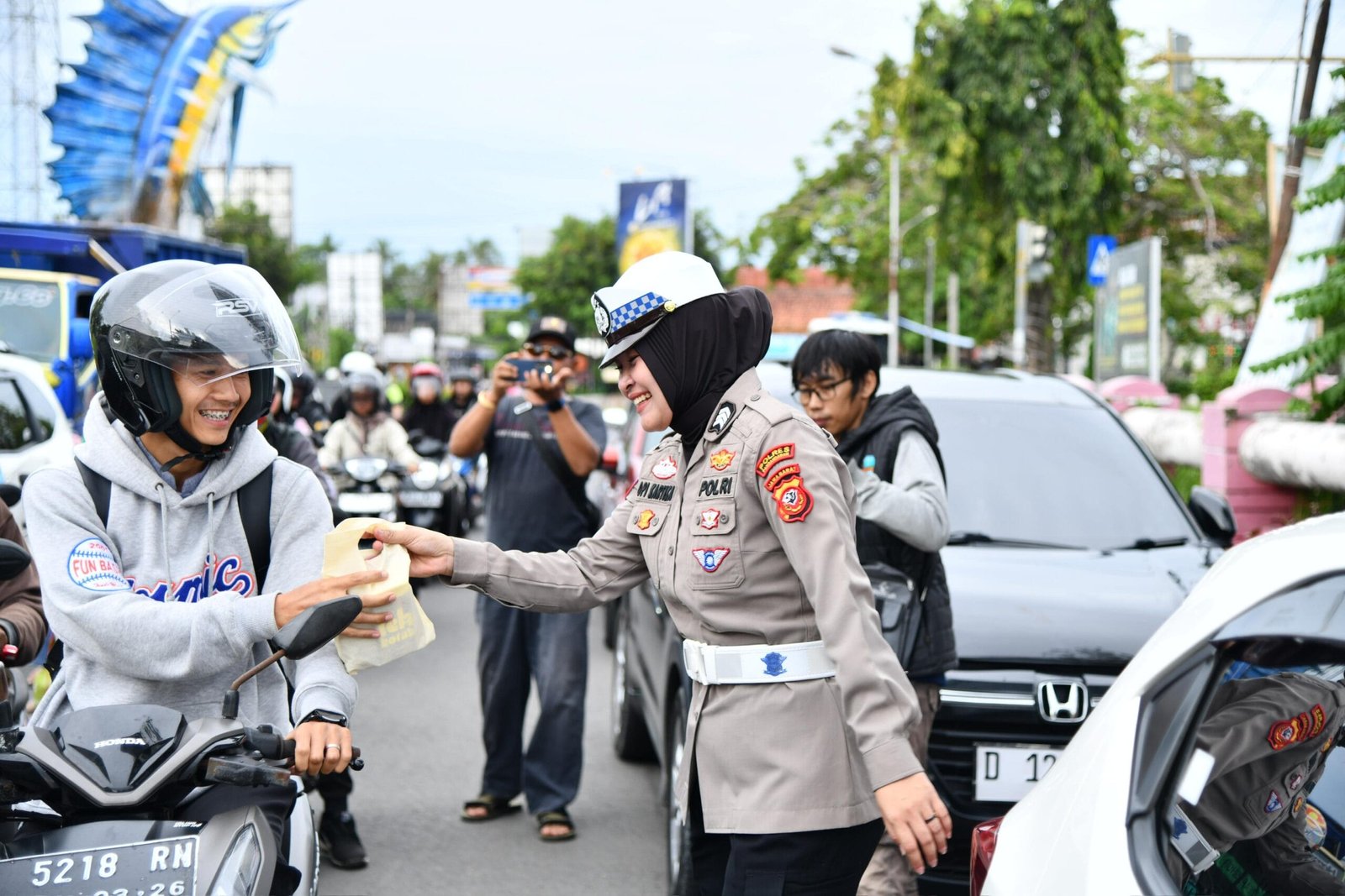 Sebanyak puluhan paket sembako dibagikan langsung oleh personel Satlantas kepada masyarakat yang berada di sekitar lokasi.