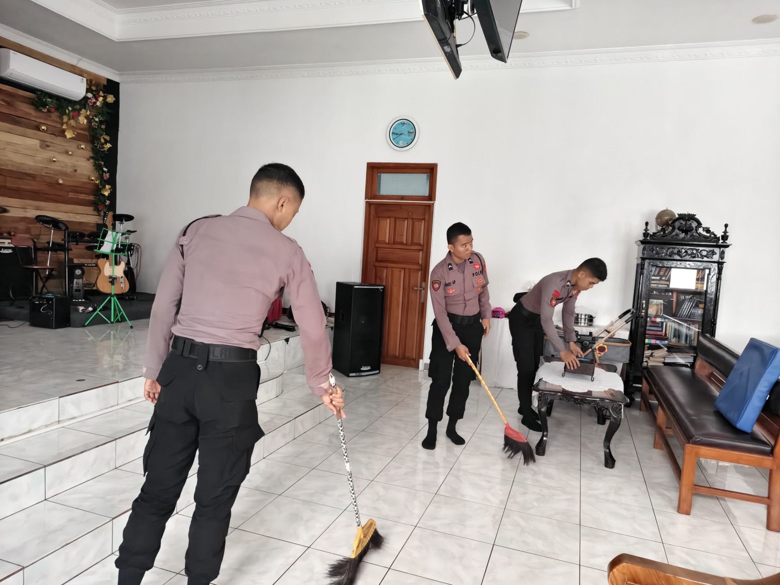 Dalam memulai kegiatan, para anggota Polres dibagi menjadi beberapa kelompok untuk mengoptimalkan proses pembersihan. Dengan menggunakan alat kebersihan seperti sapu dan kain lap, mereka bekerja sama dalam membersihkan setiap sudut gereja. Tidak hanya membersihkan lantai, tetapi juga merapikan peralatan dan dekorasi yang ada di dalam gereja, sehingga suasana menjadi lebih bersih dan rapi.