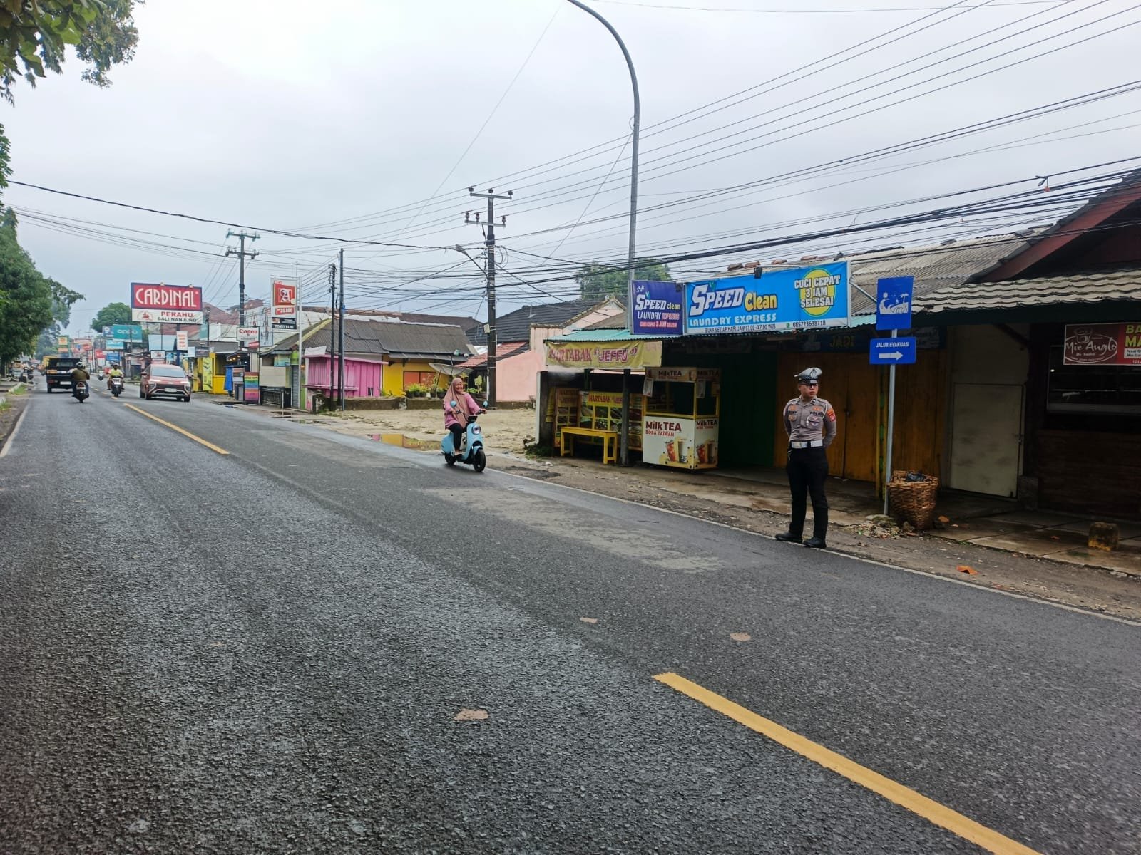 Suasana di sekitar sekolah tampak tertib dan terkendali. Anggota polisi dengan sigap mengarahkan kendaraan yang melintas serta membantu menyebrangkan siswa. Mereka berinteraksi dengan para pengendara dan memberikan imbauan untuk mematuhi peraturan lalu lintas, sehingga situasi di jalan tetap aman dan nyaman bagi semua pengguna jalan.