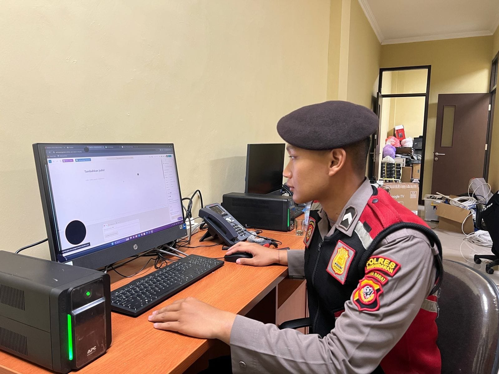 Anggota Samapta melaksanakan tugas piket di Call Center 110 dalam rangka memberikan pelayanan prima kepada masyarakat.