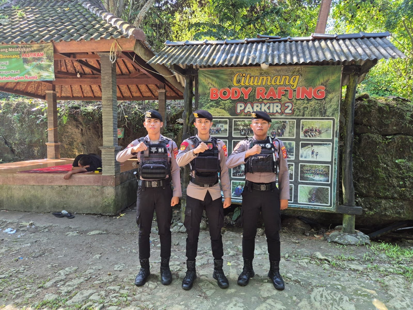 Tiga personel Raimas terlihat bersiaga di area parkir 2 Citumang Body Rafting, mengenakan seragam lengkap dan perlengkapan taktis. Mereka tampak siap siaga dalam menjaga situasi agar tetap kondusif. Pengamanan seperti ini merupakan upaya preventif guna mencegah terjadinya tindak kriminalitas, serta untuk memberikan rasa aman bagi wisatawan lokal maupun mancanegara yang berkunjung.