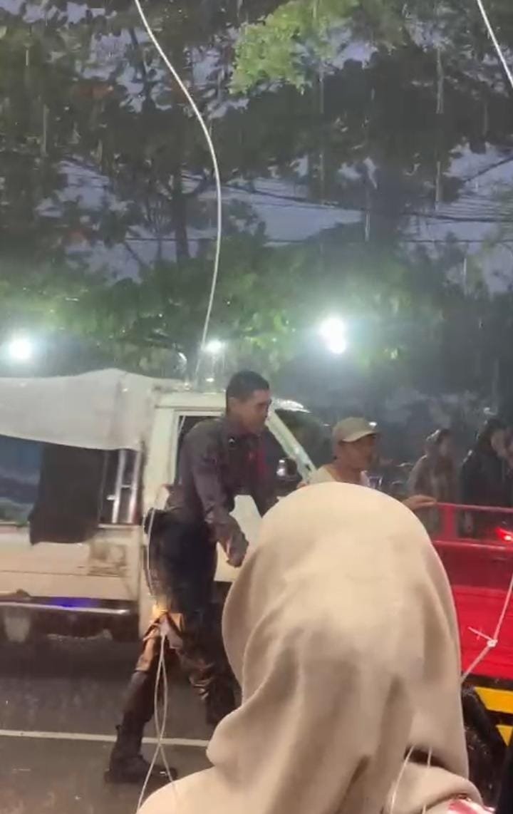 Namun, Bripda Hibar tidak gentar dengan hujan besar tersebut. Ia justru turun tangan untuk membantu pengendara yang mogok dengan mendorong kendaraan tersebut hingga bisa berjalan kembali. Wajah Bripda Hibar terlihat ceria dan penuh senyum saat membantu pengendara tersebut, meskipun cuaca sedang tidak mendukung.
