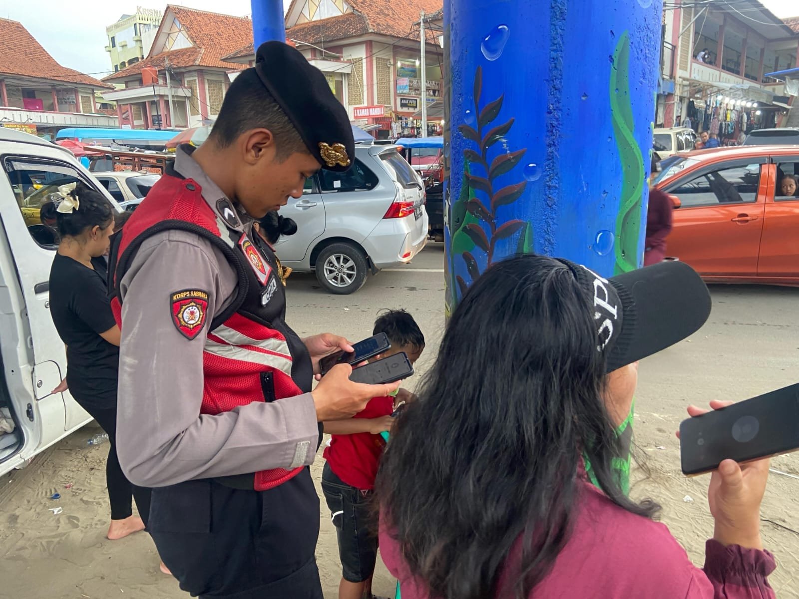 Bripda Hibar yang sedang melakukan patroli di sekitar pantai langsung mendekati keluarga wisatawan tersebut dan menawarkan bantuan. Dengan sabar dan ramah, Bripda Hibar membantu keluarga wisatawan tersebut untuk mengetahui lokasi mereka saat ini dan memberikan petunjuk arah untuk kembali ke penginapan mereka.