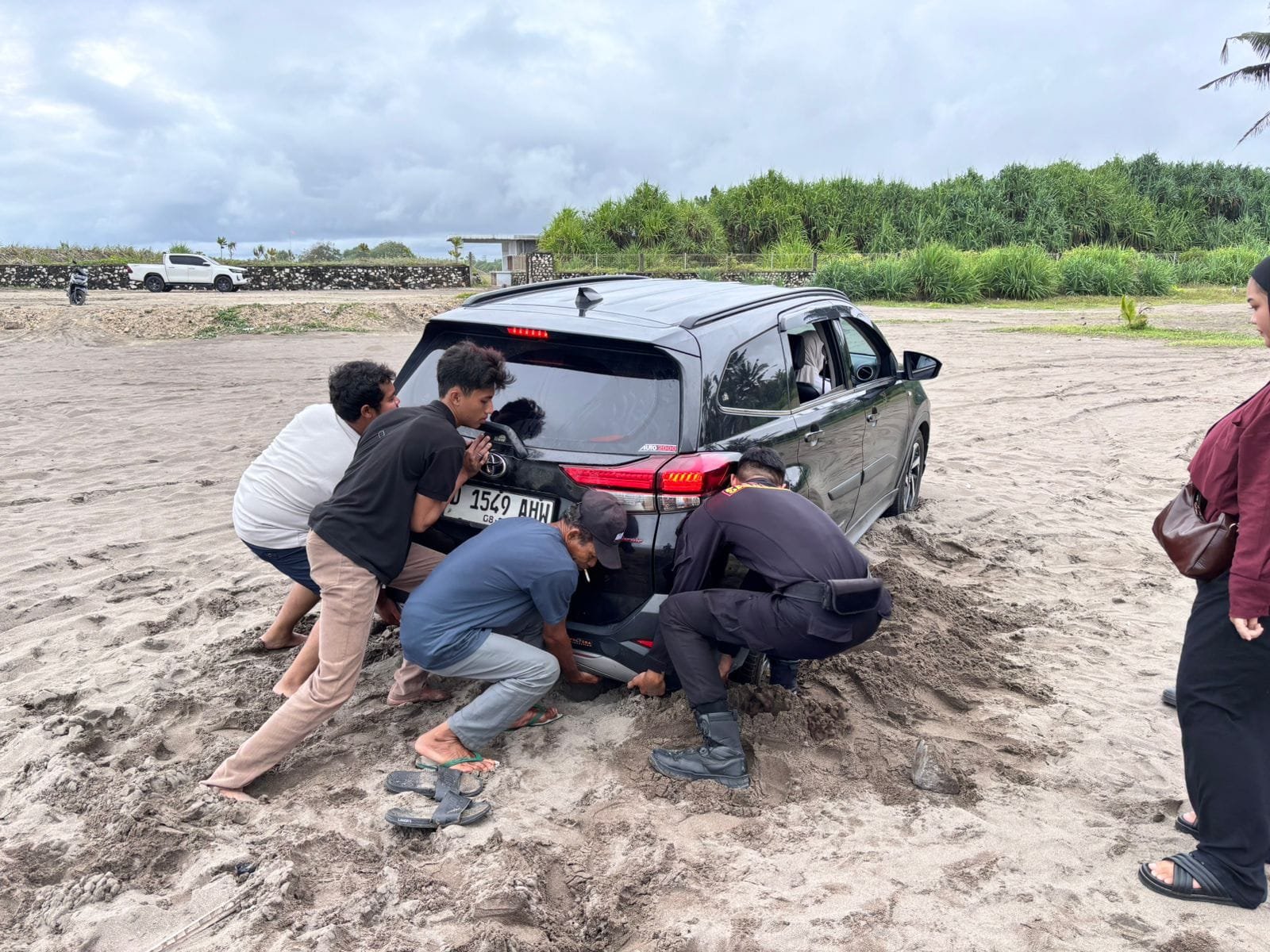 Mendapatkan informasi tersebut, personel Sat Samapta di bawah koordinasi piket fungsi langsung menuju lokasi kejadian. Setibanya di TKP, petugas Sat Samapta termasuk Bripda Hibar terlibat langsung membantu warga tersebut dengan cara mendorong dan mengarahkan kendaraan agar dapat keluar dari area pasir yang dalam. Upaya yang dilakukan berjalan lancar dan kendaraan akhirnya berhasil dievakuasi kembali ke jalur aman. Tidak ada korban jiwa maupun kerusakan berat dalam peristiwa ini.