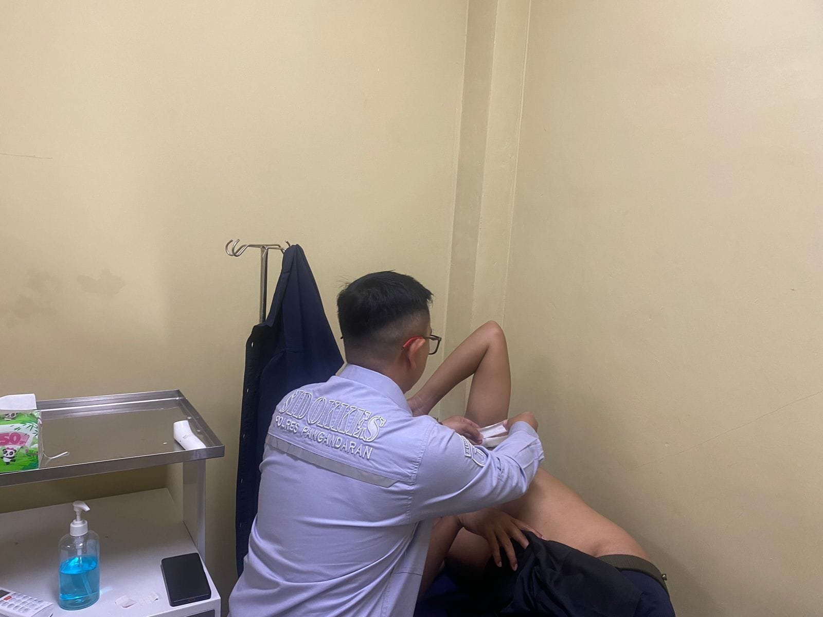 Melihat kejadian tersebut, petugas kesehatan dari Klinik Sidokkes Polres Pangandaran yang berada di lokasi langsung memberikan penanganan pertama. Warga tersebut mengalami luka lecet dan nyeri di bagian lengan akibat benturan saat jatuh.