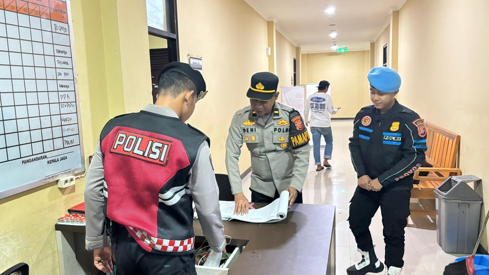 Pengecekan meliputi jumlah tahanan, kondisi ruang tahanan, dan kelengkapan administrasi. Hasilnya, jumlah tahanan 9 orang, kondisi ruang tahanan baik, dan CCTV berfungsi dengan baik.