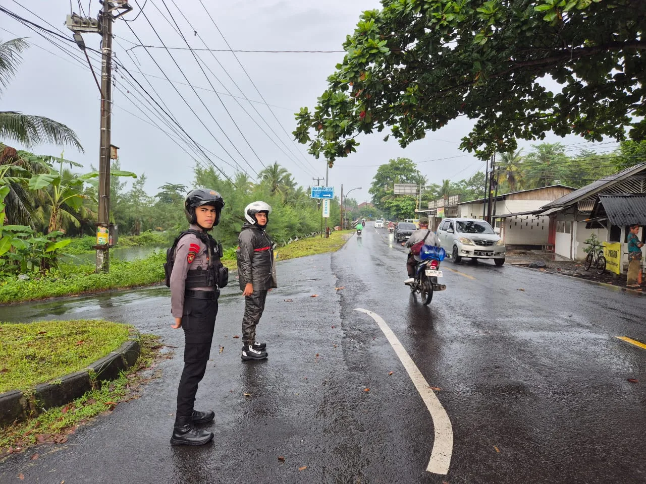 Pengaturan lalu lintas ini dilakukan untuk memastikan keamanan pengguna jalan, baik pengendara roda dua, roda empat, maupun pejalan kaki yang melintasi kawasan tersebut. Kondisi jalan yang licin karena hujan menjadi perhatian khusus dalam pelaksanaan tugas.