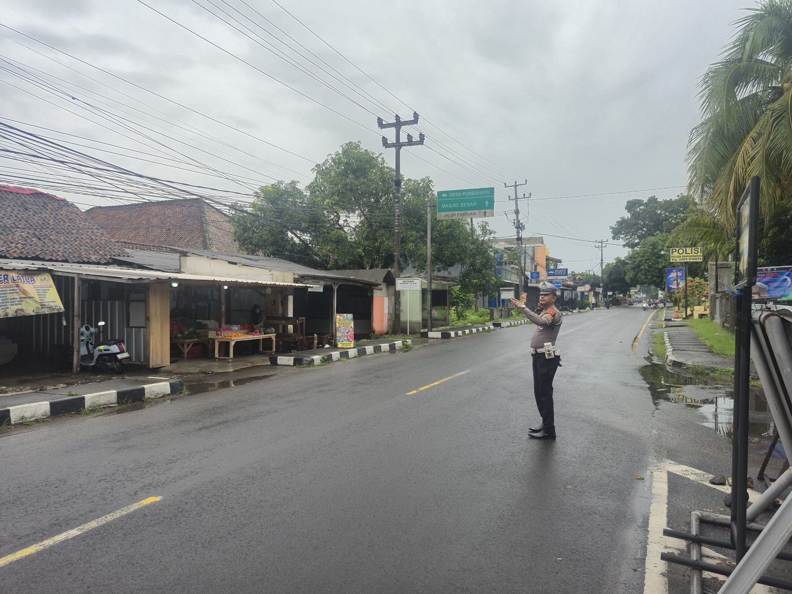 Meskipun kondisi cuaca tidak mendukung, petugas kepolisian tetap siaga dan berdiri di persimpangan untuk memastikan arus kendaraan berjalan lancar dan aman. Pengaturan lalu lintas pagi menjadi rutinitas penting dalam mendukung mobilitas masyarakat yang hendak beraktivitas, baik menuju tempat kerja maupun sekolah.
