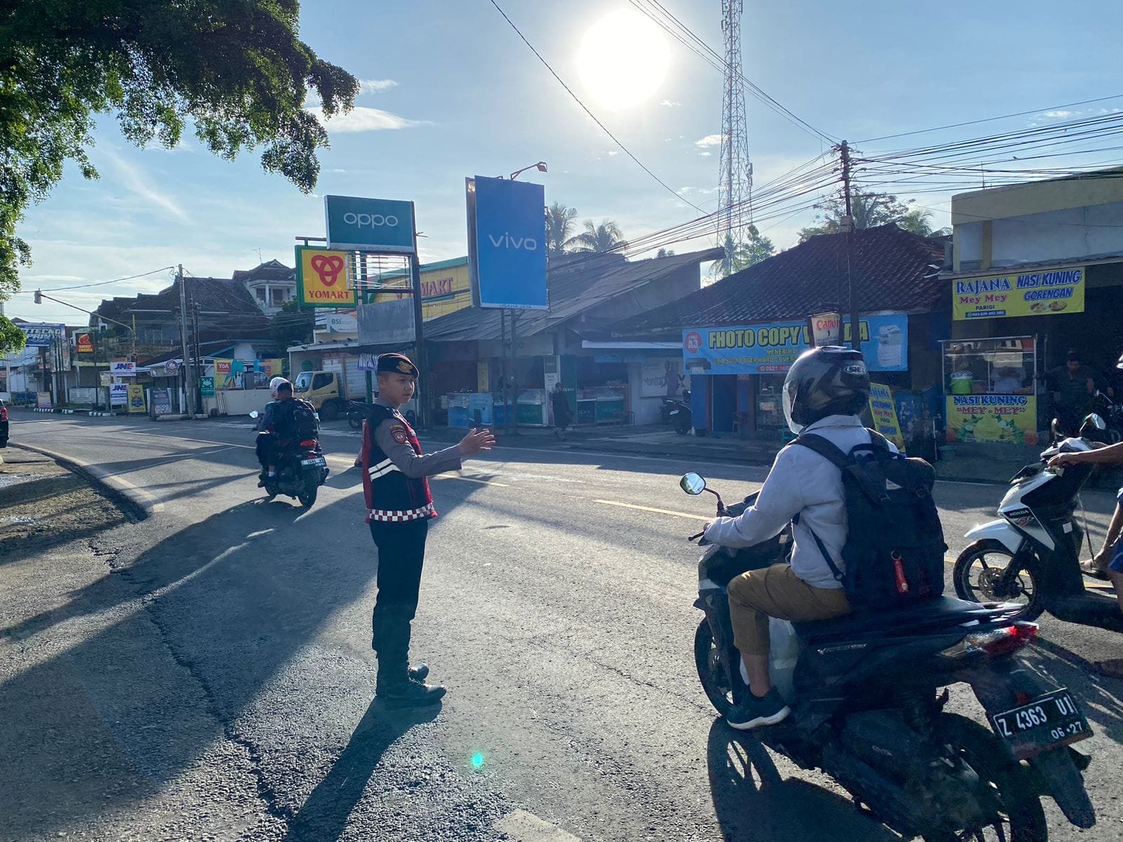 Dengan cuaca cerah, pengaturan lalu lintas di Simpang 3 DPRD Kabupaten Pangandaran berjalan lancar tanpa hambatan, menciptakan rasa aman dan nyaman bagi masyarakat.