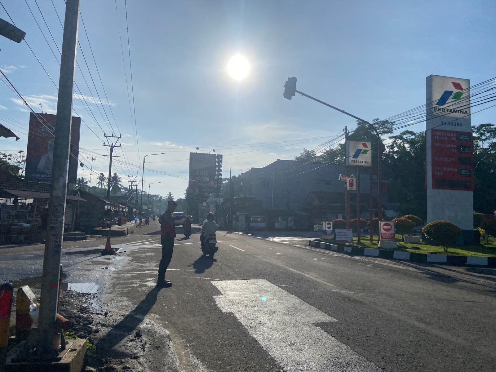 Sejak pagi hari, volume kendaraan yang melintas meningkat signifikan. Kehadiran petugas membantu mengarahkan arus lalu lintas agar tetap tertib dan aman bagi semua pengguna jalan.